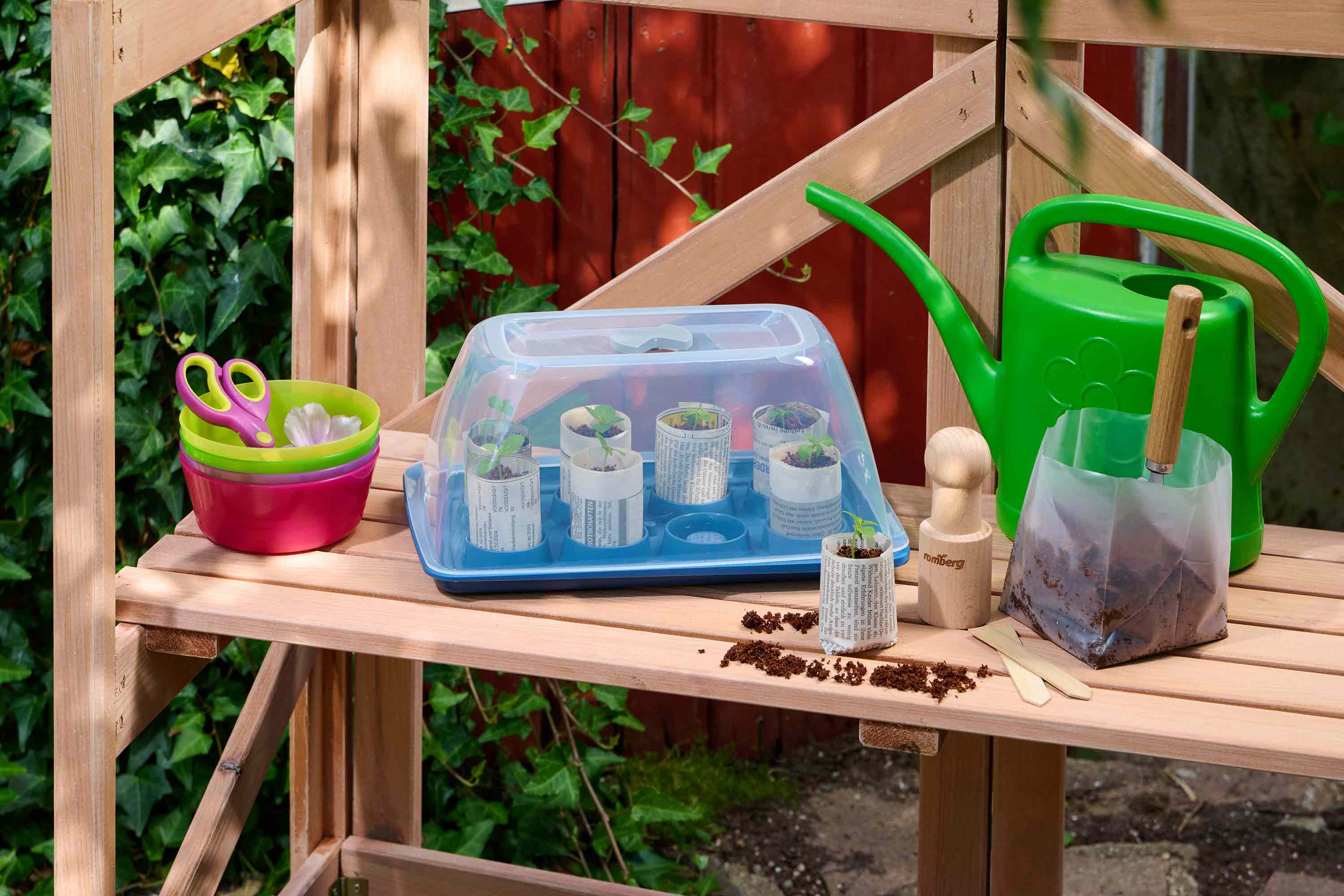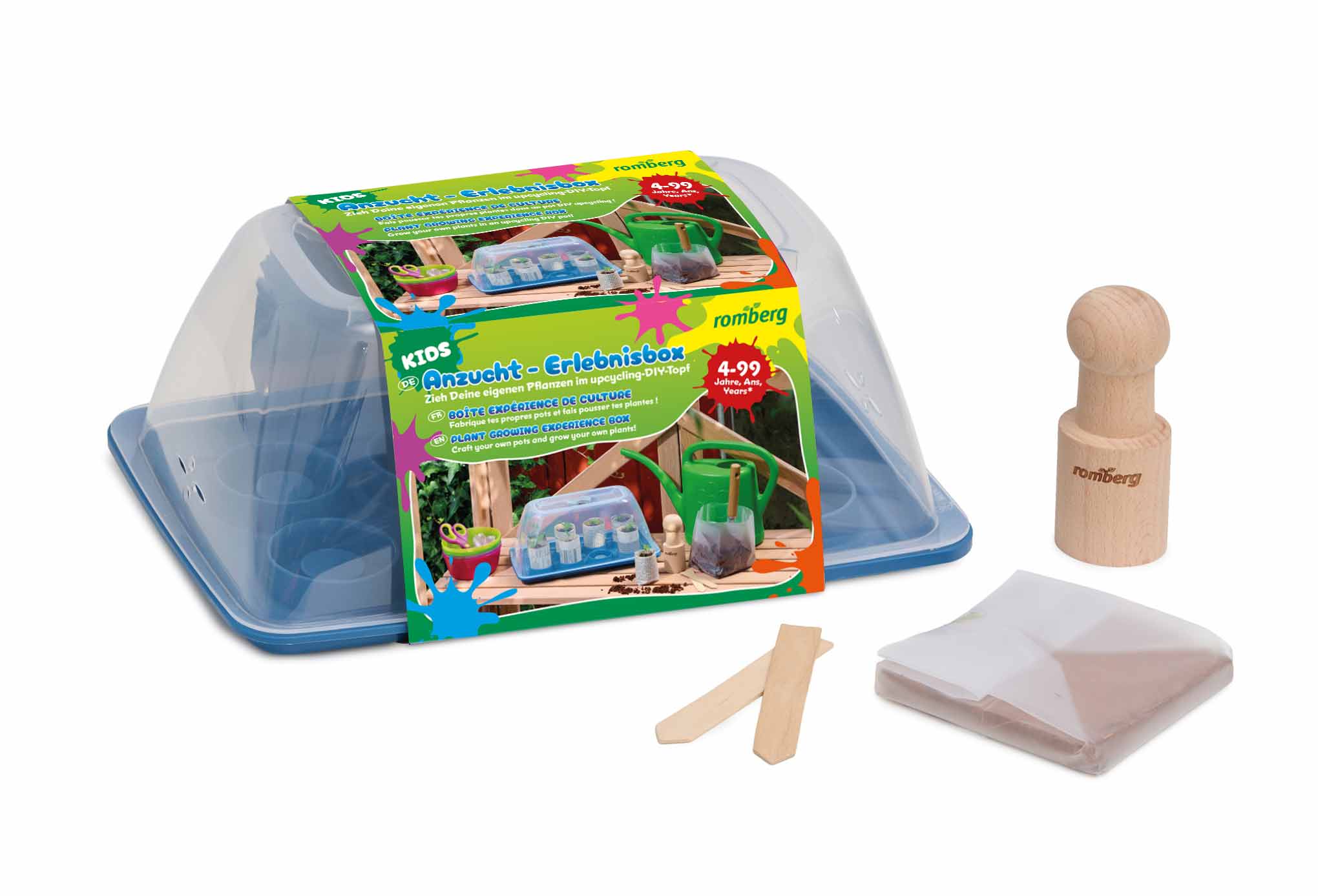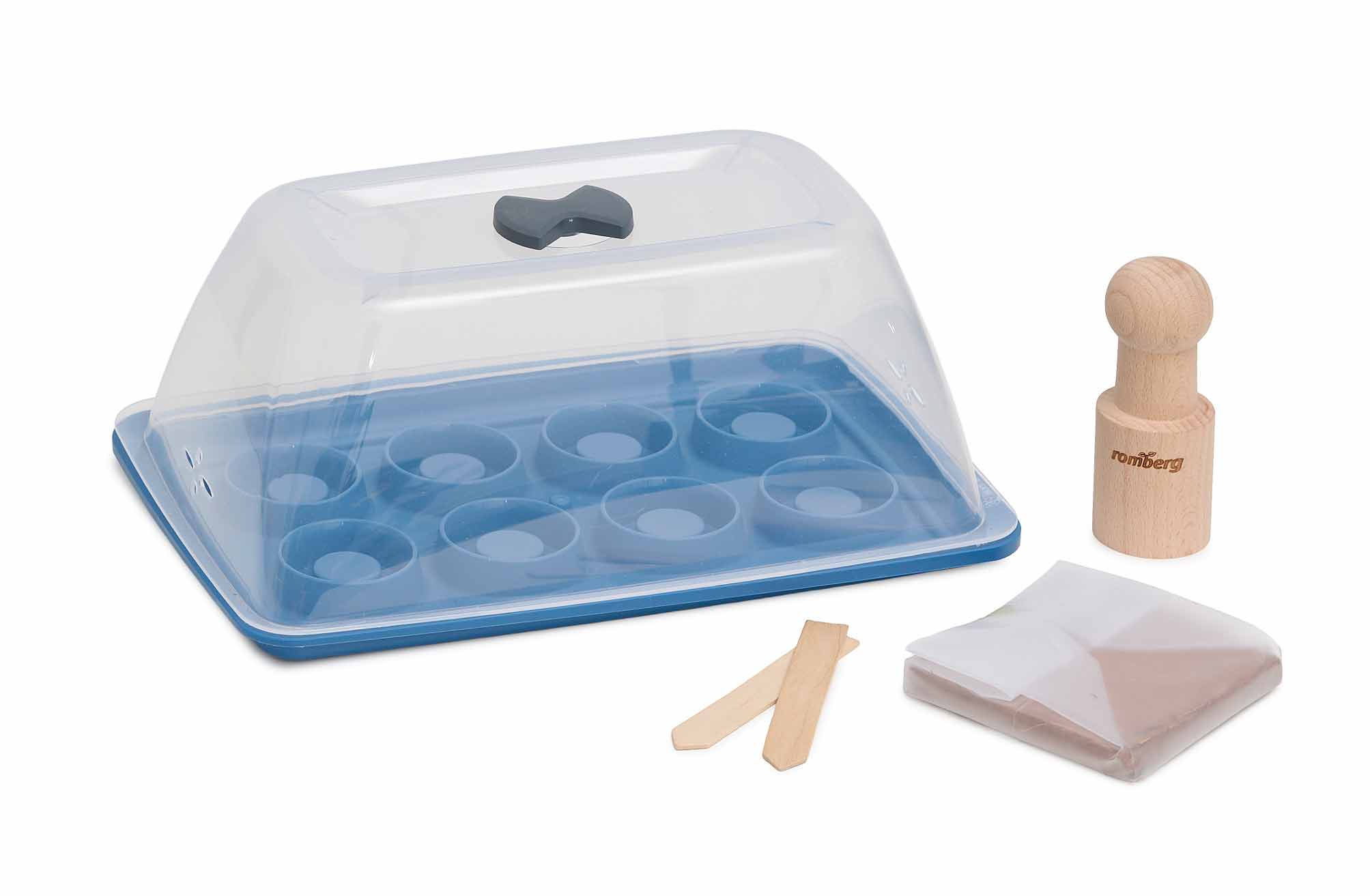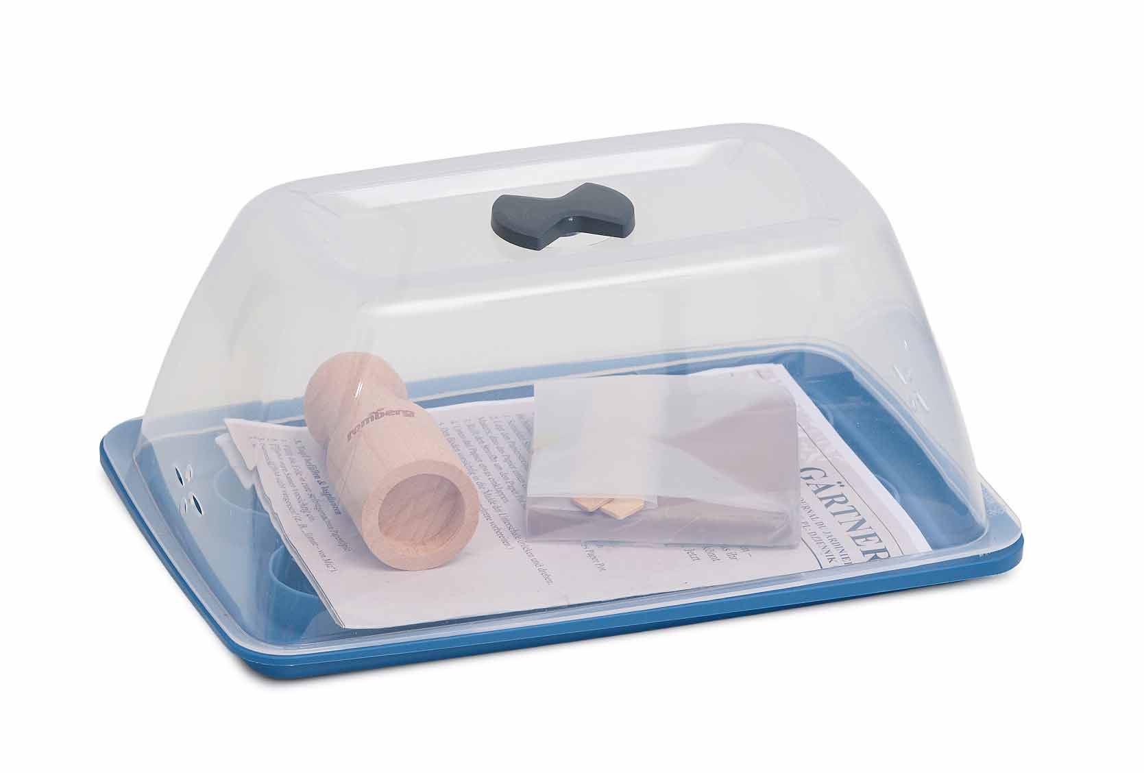 | Setinhalt | Unterschale mit Vertiefungen, bruchsichere Haube mit Schieberegler, Papiertopfpresse (Holz), 2 Holz-Stecketiketten, 1 l Kokos-Anzuchterde, Anleitung |
