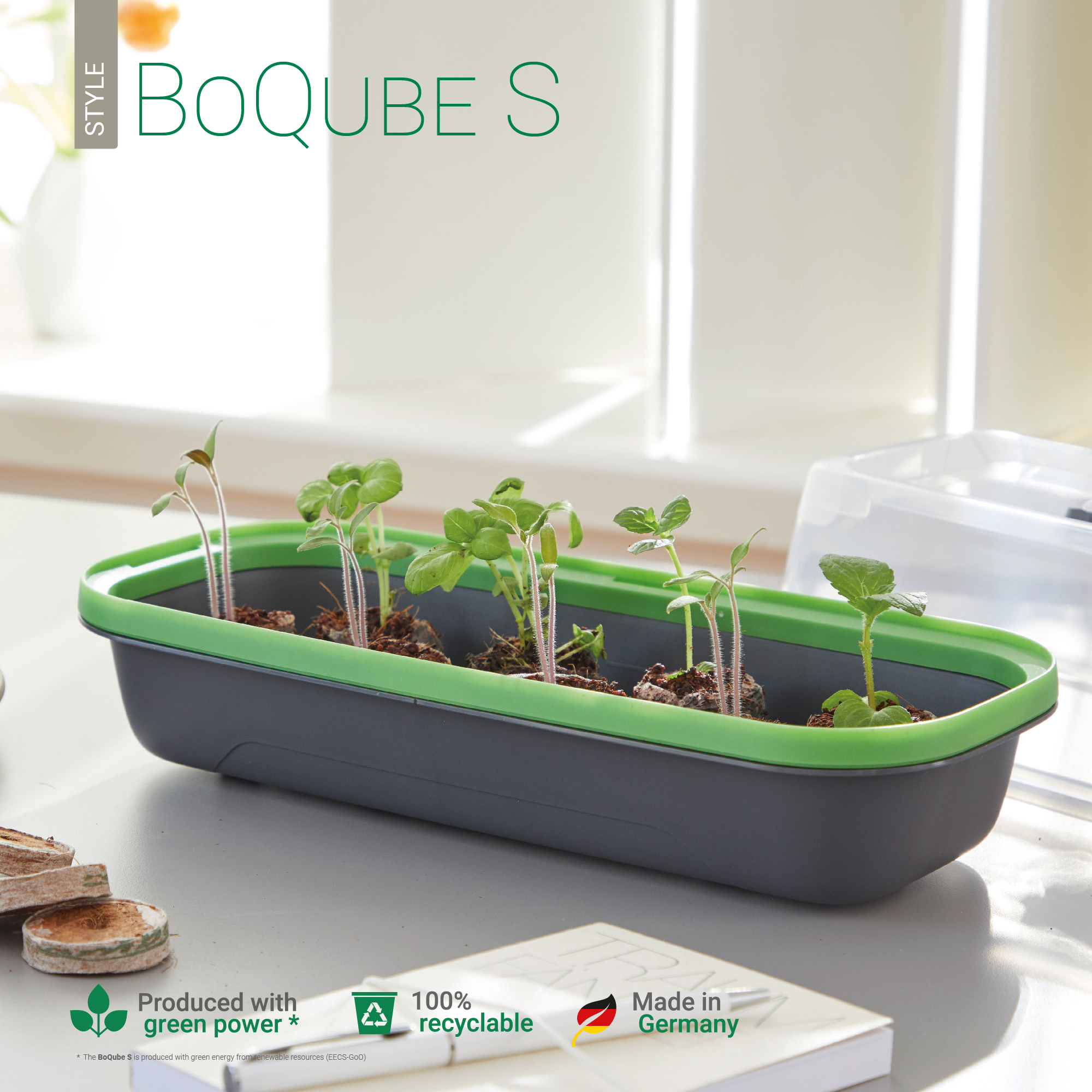 City-Gärtnern bringt so viel Spaß. Denn du kannst jedes Jahr Neues ausprobieren. Leider hat nicht jeder ein Zuhause mit viel Raum für eine beschützte Anzucht von Blumen, Kräutern und Gemüse. Aber das braucht es auch nicht! Das Mini-Gewächshaus BoQube S von Romberg ist für diejenigen bestimmt, die wenig Platz haben, gleichzeitig eine kleine Anzahl verschiedener Pflanzen für ihre Töpfe, Kästen und Hochbeete anziehen möchten und ein Faible für funktional gestylte Gewächshäuser haben. Die recycelbare Anzuchtschale vom Gewächshaus BoQube S hat Platz für 8 Kokos-Quelltabletten und kann mit einer Grundfläche von 28 x 12 cm selbst auf schmalen Fenstersimsen sicher aufgestellt werden. Zusammen mit der BoQube Anzuchthaube S formt sie ein perfekt ausgestattetes 13 cm hohes Zimmergewächshaus. Da der Kunststoff vom schicken BoQube Gewächshaus S nach einem Bad im Spülwasser tipptopp aussieht, ist es jahrelang ein Hingucker. Eben: Klein und fein!