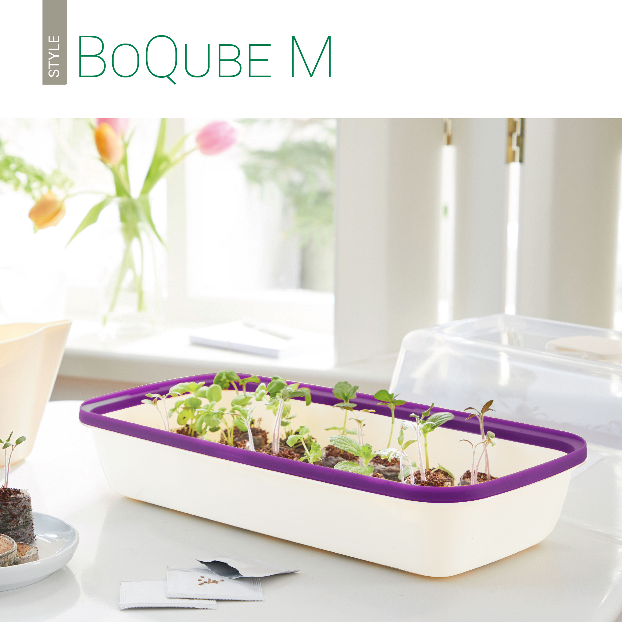 Das moderne Zimmergewächshaus BoQube M ist ein Gewinn für alle Anzuchtgärtner*innen aus Stadt und Land, die Zuhause unkompliziert eine überschaubare Schar von Blumen, Gemüse und Kräuter anziehen möchten. Denn es bereitet mit seiner perfekten Ausstattung Sämlingen und Stecklingen ein prima Kleinklima, räumt jungen Pflanzen beim Sprießen mit einer Größe von 37 x 19 x 18 cm ausreichend Platz ein und sieht zudem noch extrem gut aus. Das BoQube M setzt sich aus zwei recycelbaren Elementen zusammen, und zwar aus der BoQube Anzuchthaube M und der BoQube Anzuchtschale M. Die bruchsichere Anzuchthaube erhascht jeden Lichtstrahl und ist mit einem drehbaren Regler ausgestattet, über den du manuell jeder Zeit Temperatur und Luftfeuchte steuern kannst. Zudem macht eine seitliche Öffnung im milchigen Gehäuse es möglich, sensible Pflanzen zu wässern – ohne dass Temperatur und Luftfeuchte im Gewächshaus BoQube M schwanken. Unabhängig davon ist ein regelmäßiges Lüften während der Anzucht wichtig.