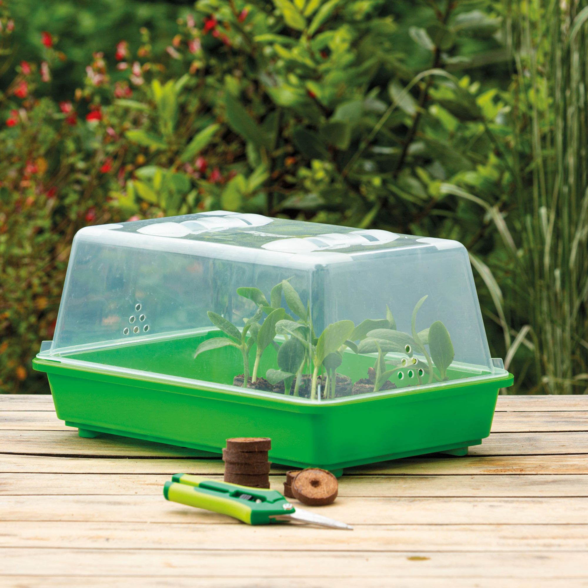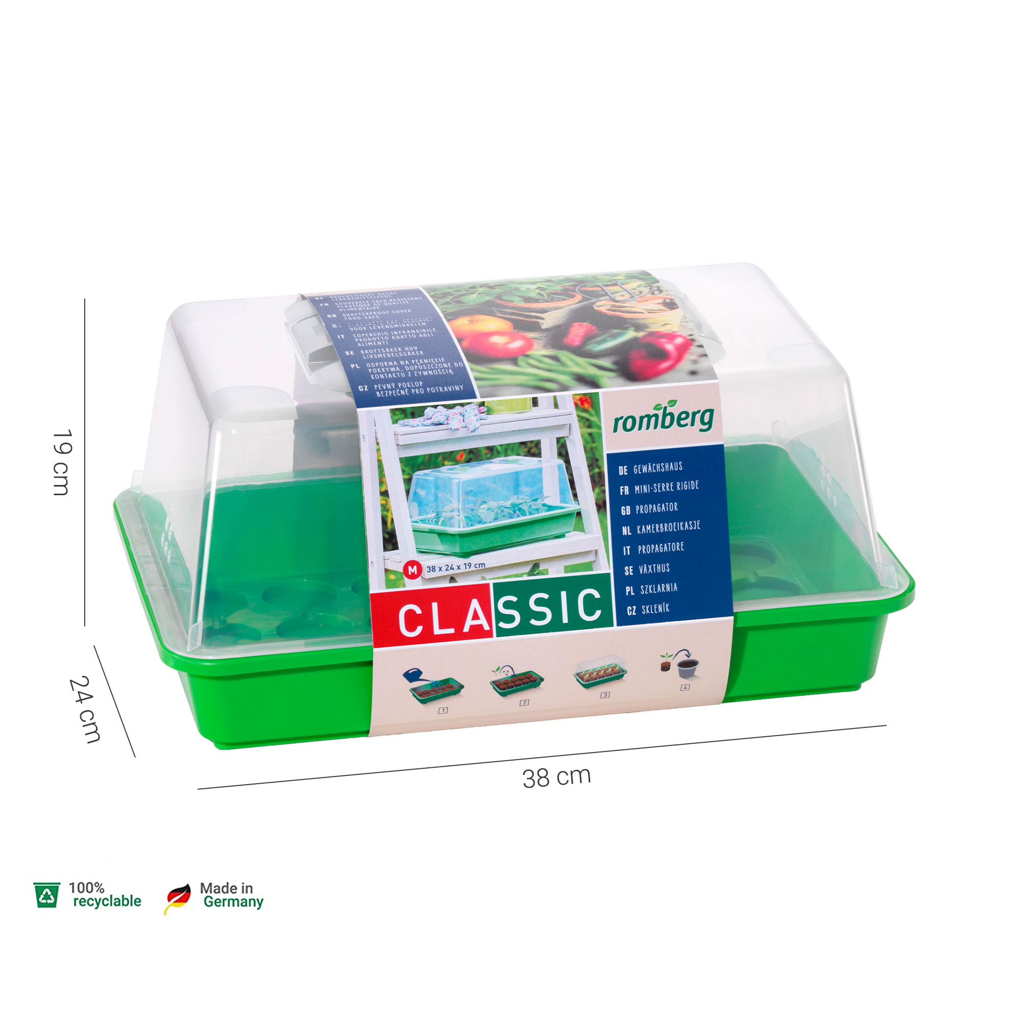 Das 38 x 24 x 19 cm große klassische Gewächshaus M ist ideal für die Anzucht von einjährigen Gemüsen und Sommerblumen, die im zeitigen Frühjahr bei der Anzucht viel Wärme und Licht brauchen. Seine stabile Anzuchtschale hat Platz für 28 Kokos-Quelltabletten, in denen du Gemüse mit großen Samen wie Kürbisse oder Zucchini großziehen kannst. Sommerblumen sät man besser in abbaubaren Anzuchttöpfen oder mehrfach verwendbaren Kunststofftöpfen aus. Vergiss aber im Eifer des Gefechts nicht, alle Anzuchttöpfe im klassischen Zimmergewächshaus M nach der Aussaat mit Schildetiketten zu bestücken.