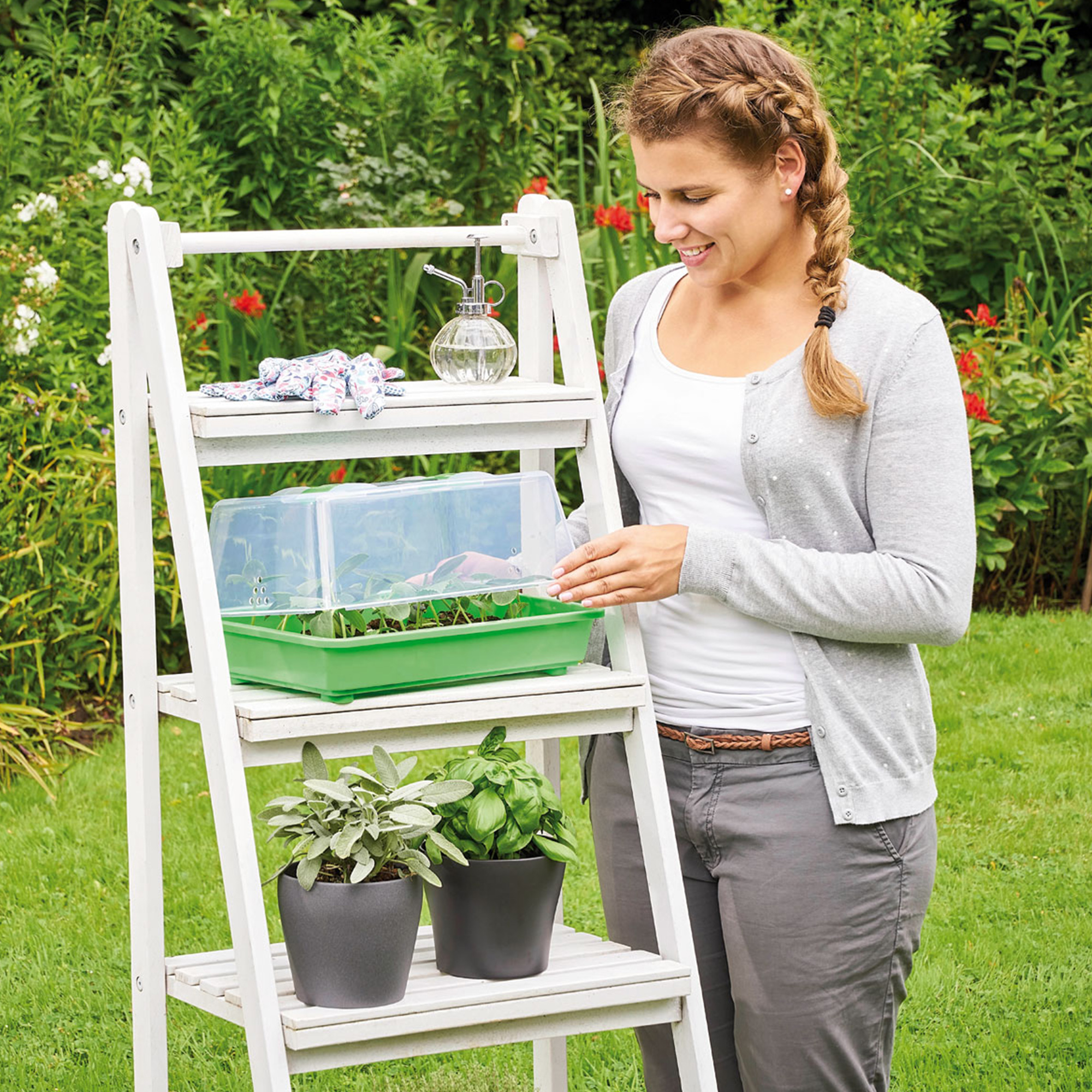 Die kleinen Bewohner sind im lebensmittelechten aus 100 % recycelbaren Kunststoff geformten klassischen Gewächshaus M gut verwahrt. Ein Schieberegler im Dach und seitliche Belüftungslöcher in der Anzuchthaube lassen die Luft zirkulieren und halten Temperatur und Luftfeuchte aufrecht. Trotzdem solltest du deinen Pflanzennachwuchs täglich zweimal lüften und regelmäßig gießen. Für das gleichmäßige Verteilen des Gießwassers sorgen Wasserrinnen auf dem Boden der Anzuchtschale. Sie fangen auch das Kondenswasser auf, welches von der Haube zurück in die Schale läuft. Wenn du keine helle Fensterbank hast, kannst du die Sämlinge im klassischen Gewächshaus M mit einer LED-Pflanzenbeleuchtung bestrahlen, die montiert werden muss.
