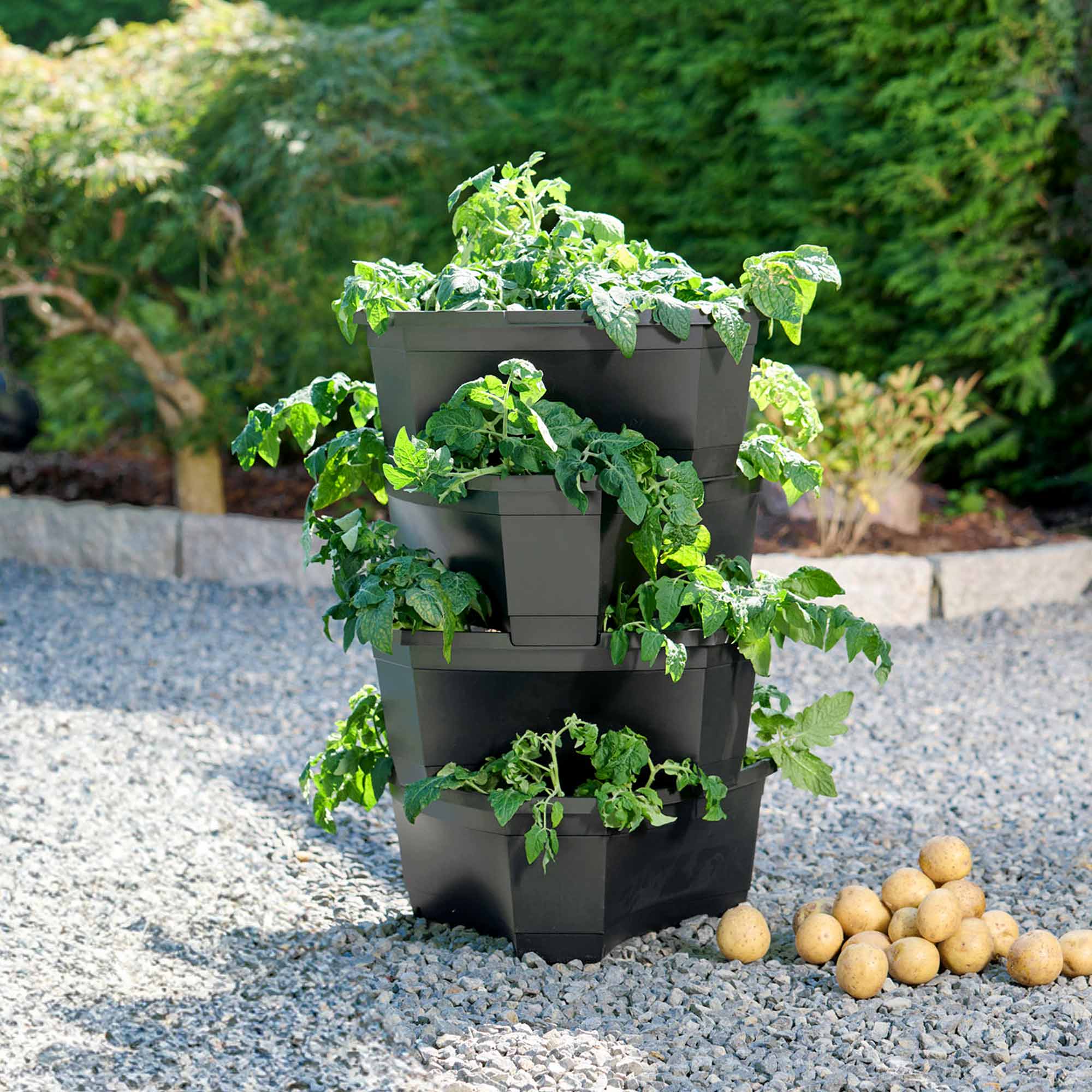 Der Romberg Kartoffel- und Pflanzturm aus 100% recyceltem Kunststoff mit vier Dekorativen und stapelbaren Einzelschalen ist eine vielseitige Pflanzpyramide, die sich ideal für Kartoffeln, Küchenkräuter, Gemüse, Salat und Erdbeeren sowie Blumen eignet. Dank der Überlaufkonstruktion ist eine Anti-Staunässe gewährleistet, während der gelochte Boden eine durchgängige Schalenbewässerung ermöglicht. Der Turm ist für den Einsatz auf Balkonen, Terrassen und im Garten geeignet. Sie Punkten nicht nur mit attraktivem Design, durchdachter Funktionalität und effizienter Verpackung – sie ermöglichen hohe Ernteerträge auf kleinstem Raum.