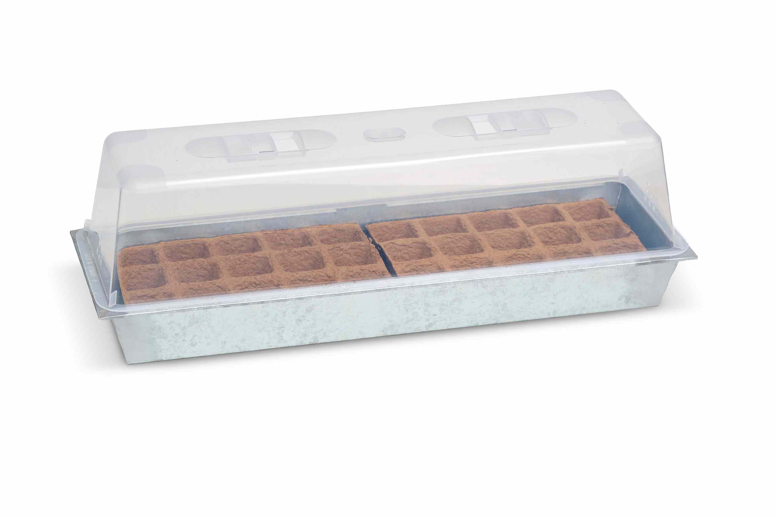 Die verzinkte Anzuchtschale sorgt für Stabilität und Langlebigkeit, während die transparente Haube ein ideales Klima für die Keimung schafft.
