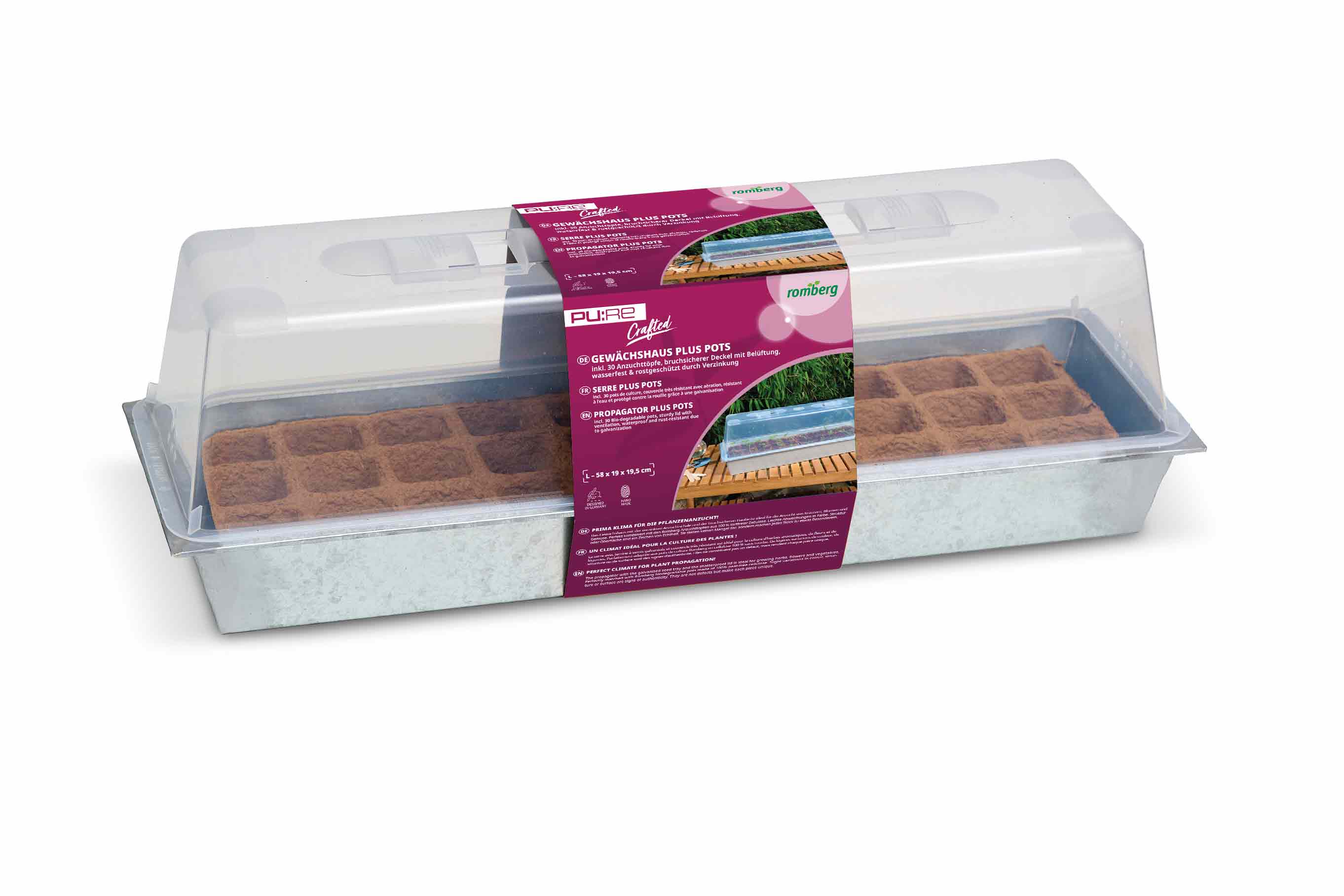 Das PU:RE CRAFTED Gewächshaus L PLUS POTS kombiniert eine robuste, verzinkte Anzuchtschale mit einer bruchsicheren Haube und 30 biologisch abbaubaren Anzuchttöpfen. Es schafft perfekte Bedingungen für eine erfolgreiche und nachhaltige Pflanzenanzucht.
