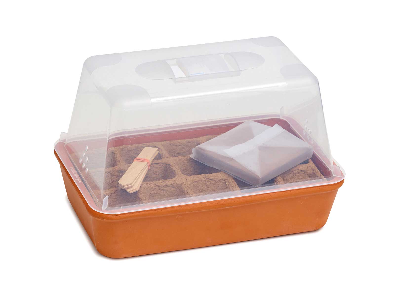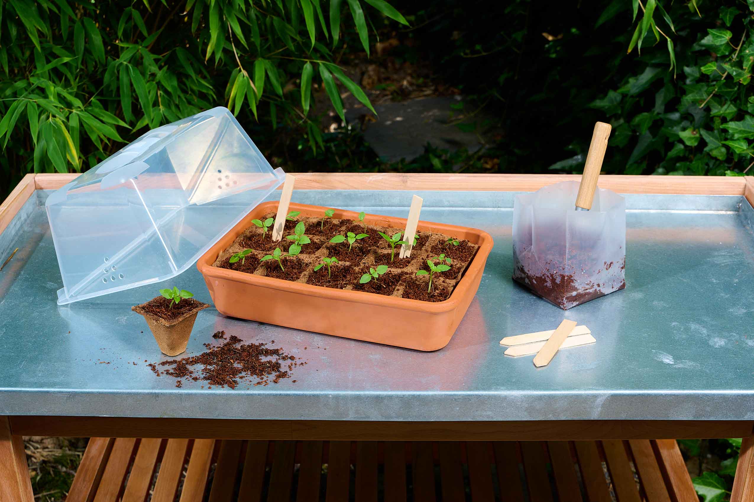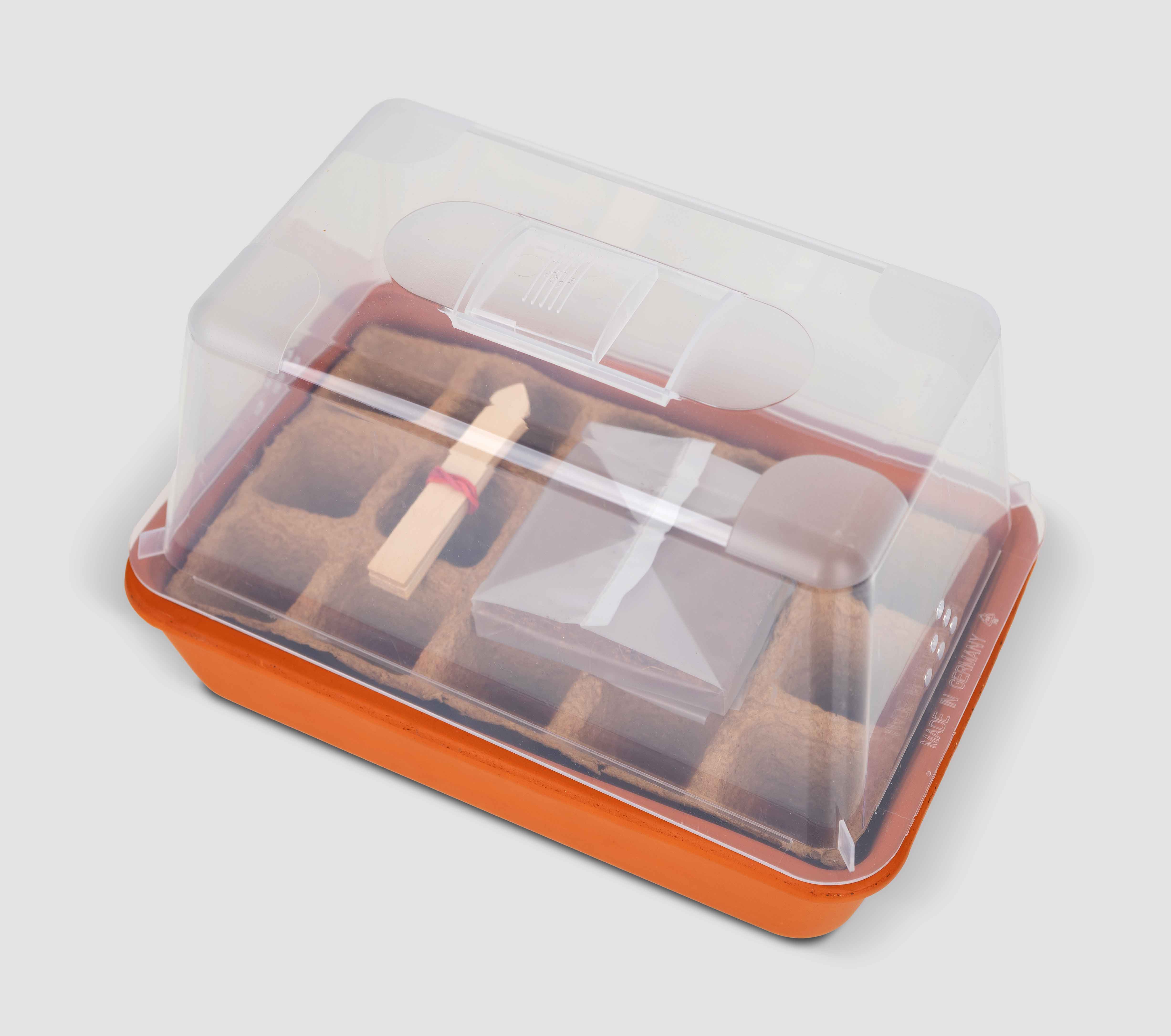 - Materialien: Terracotta, klarer Kunststoffdeckel, Kokossubstrat, Pflanzenfaser-Töpfe, Holzetiketten