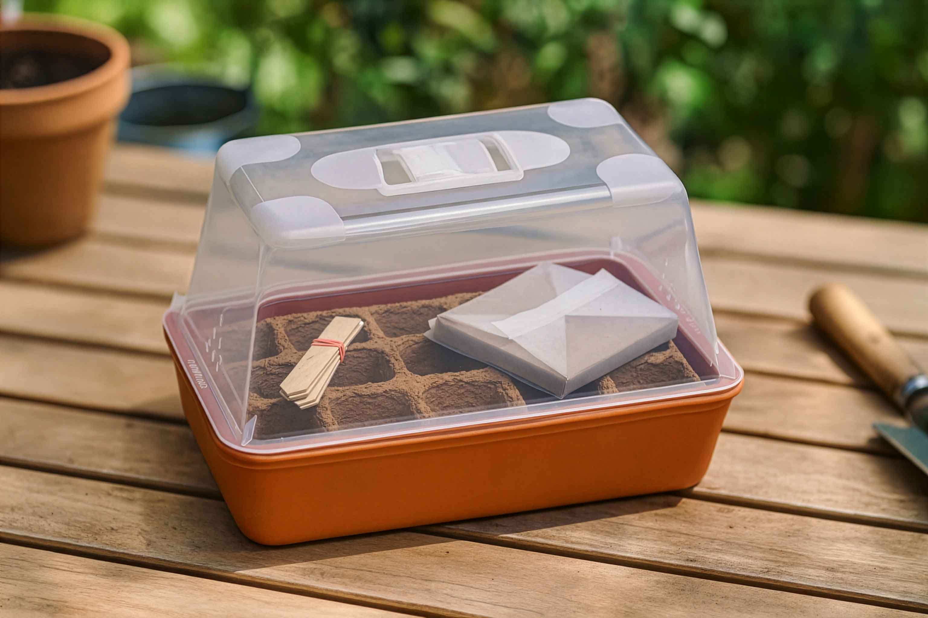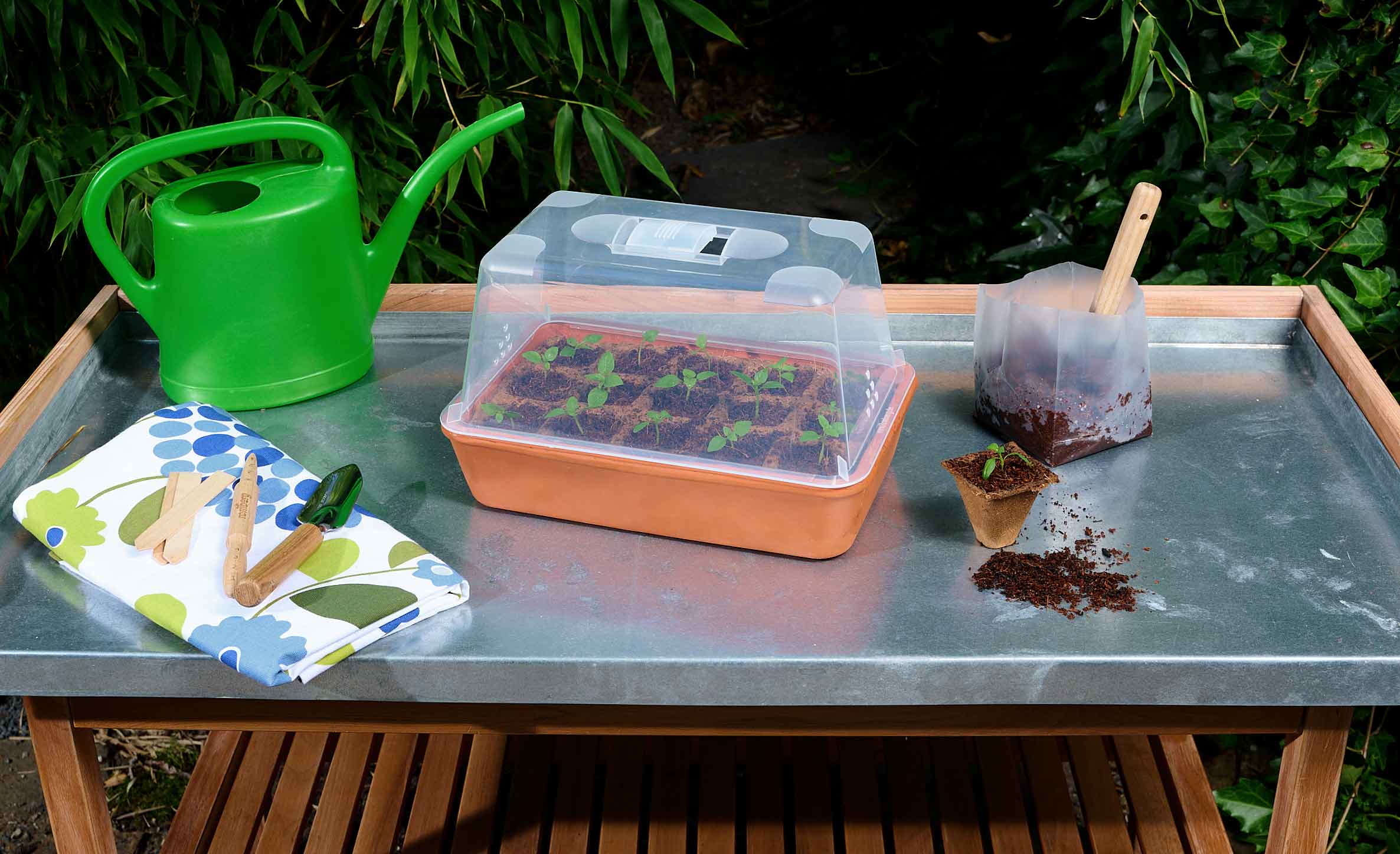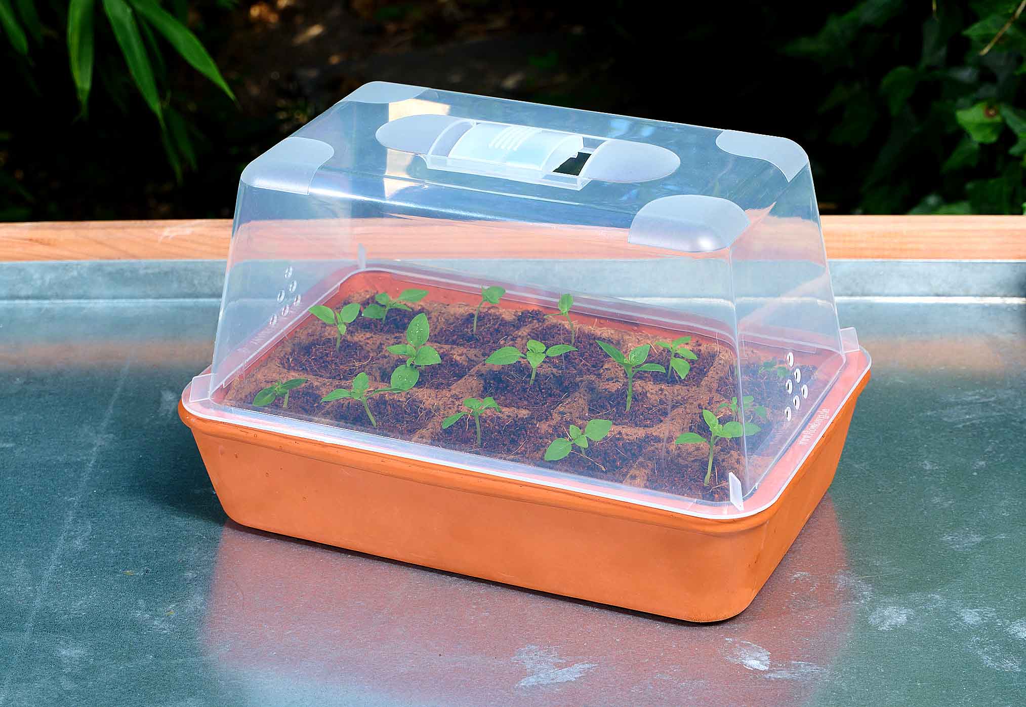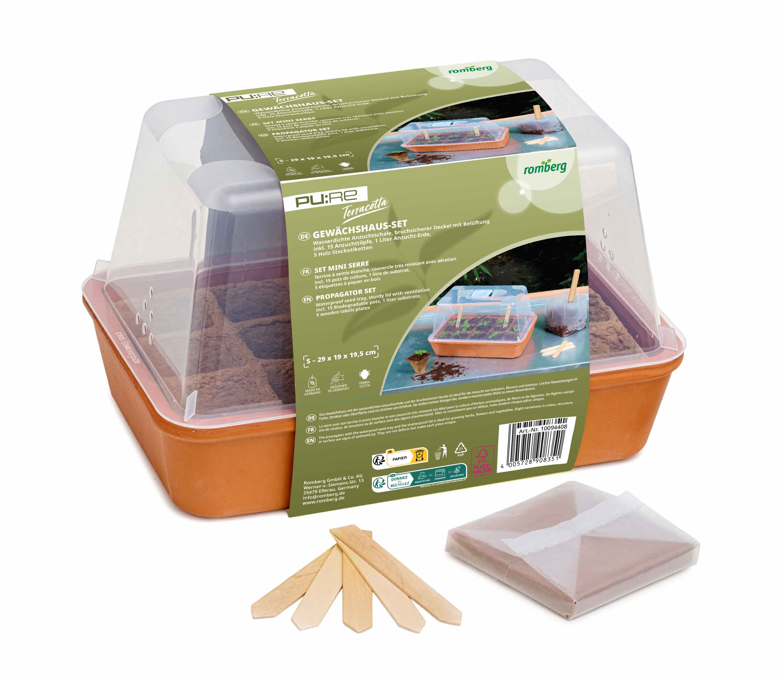 - Materialien: Terracotta, klarer Kunststoffdeckel, Kokossubstrat, Pflanzenfaser-Töpfe, Holzetiketten