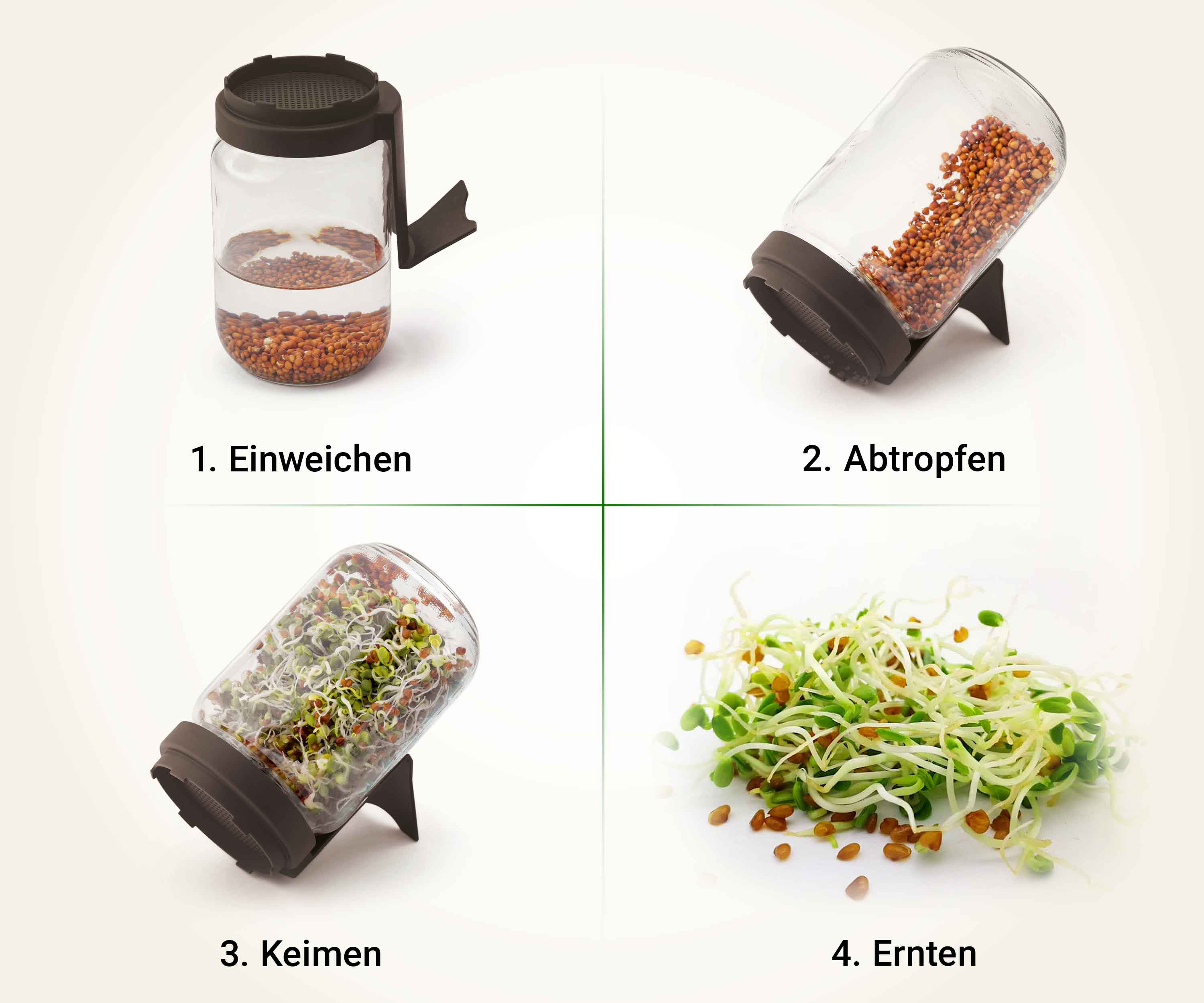 Ob auf dem Brot, im Salat, im Smoothie oder als Topping auf Bowls – deine selbst gezogenen Sprossen bringen Frische, Nährstoffe und Geschmack in deinen Alltag. Die Reinigung? Super easy: Deckel und Glas wandern einfach in die Spülmaschine. Und weil es aus hochwertigen Materialien in Deutschland gefertigt ist, kannst du dich auf langlebige Qualität verlassen.
